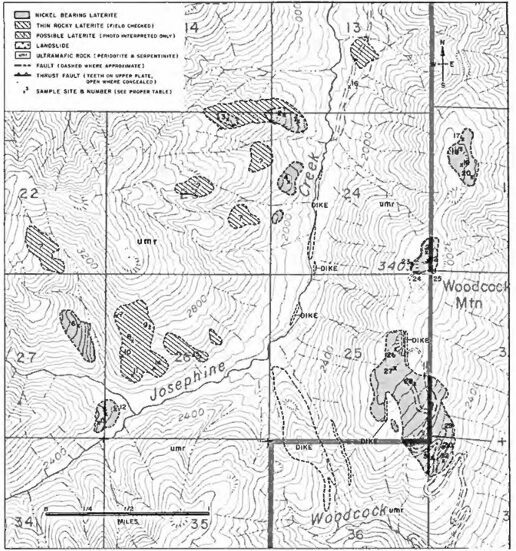 Figure 2. Geologic map of Josephine Creek and Woodcock Mountain showing previously identified laterite lenses (after Ramp, 1978).