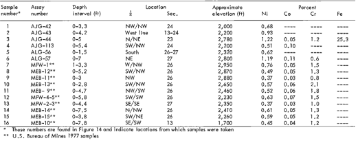 Results from previous work (Figure 2 and Table 1) include 1.22% nickel over 5 feet from surface in auger hole AJG-44 (located within section 23) and 1.19% nickel over 7 feet in ALG-57 (in section 27) within an area of mapped laterite extending across 190 ac and having a maximum depth of 30 feet. Cobalt and chromium were also sampled.