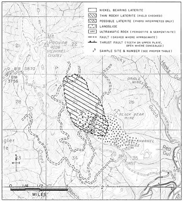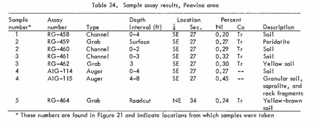 Although the nickel grades uncovered at Peavine Mountain were low grade (relative to other areas), increased nickel grades may be indicated at depth and further exploration at Peavine was considered justified. Most of the mapped laterite lens remains unsampled. The Property is considered prospective by Homeland because the laterite lens is large and remains under-explored.